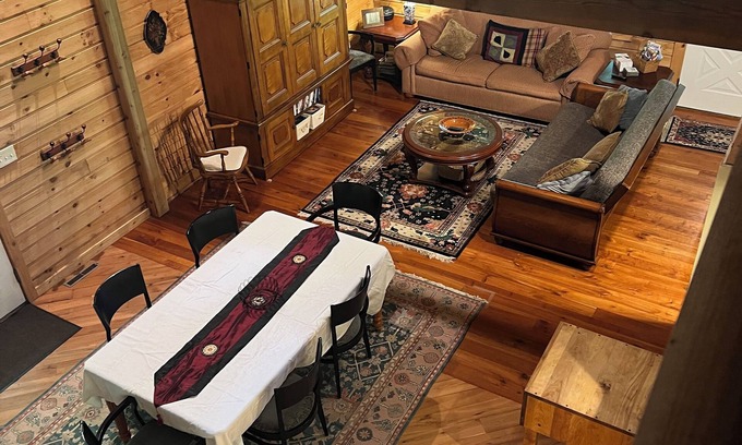 On the expansive front porch you can enjoy the wind chimes as you sit and overlook the valley with a glass of wine. There is comfortable couch and chairs to relax on as well as a rocking chair and porch swing. The spacious great room with its high ceilings and open floor plan is wonderful for a large group or a few couples. There is are two full size couches with a TV anda new smart tv, we have starlink and it's been working well but it's possible in inclement weather you may need to resort to the dvd player. We also have a wonderful stand up Baldwin Piano, generally kept in tune! The full kitchen has plenty of workspace for anyone who would like to cook a gourmet meal. It is fully stocked with plenty of plates, serving items, glass and a fantastic dishwasher. There is also general kitchen items available, like salt,pepper,oil flour. We have two bedrooms on the first floor. The “Winter” room which has a Queen Bed facing east towards the sunrise has a large closet and dresser as well as a beautiful antique headboard. The “Summer Room” has a King Bed and overlooks the front porch and view of the valley it also has a large closet and dresser. The full bath with a tile tub and shower also includes a double sink vanity. The laundry room has a washer dryer and utility sink. The second floor has a loft with a recliner and is a great place to curl up with a book, if extra beds are needed this is the perfect spot for an air mattress. We have just added a new office work station with a monitor. We are using starlink so the streaming serivce in this remote area is working fairly well but may struggle to run many devices with inclement weather. There are two bedrooms on the second floor. The “Fall” Master Bedroom with its poster king bed and room darkening curtains is welcoming and wonderful for those who need a very quiet place to rest. The second bedroom is our “Spring Room” and has bunk beds and a trundle bed so 3 can sleep comfortably in this room. With the brightly decorated curtains it’s a perfect room for the kids.
