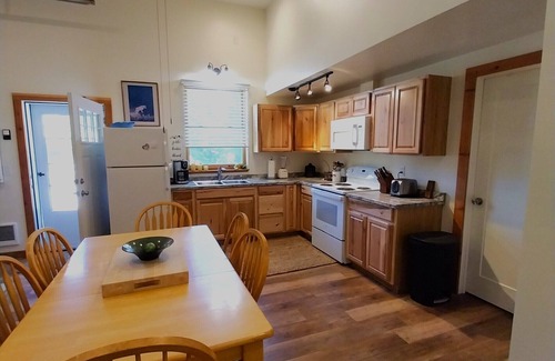 The living room has a loveseat with a pull-out bed (full-size), arm chair and footstools with flat-screen tv with Roku Firestick (bring your app passwords). Internet is also available. There is a desk with chair and the dining table can easily seat 6.