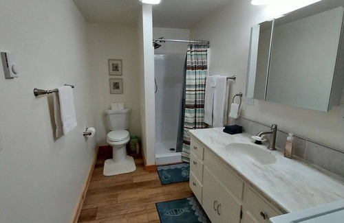 The bathroom has a shower, toilet, and vanity area that also includes the washing machine and dryer. Towels, wash clothes, soap, hair dryer, shampoo and conditioner are also provided for your convenience.