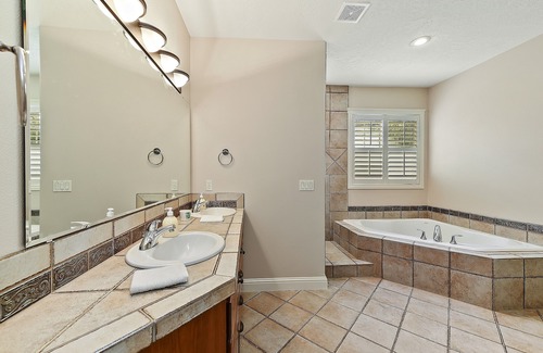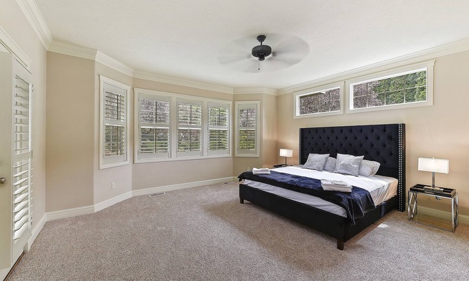 Spacious room for two with a spa-like bathroom, and soak tub, with linens and bath towels, private patio and access to living room with fire place and fully equipped kitchen with stainless steel appliances, washer and dryer. This room is in a large shared house.