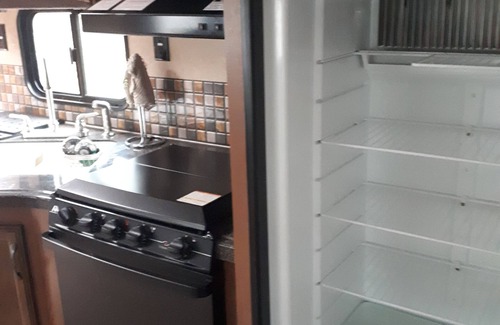 Queen bed plus two large bunk beds; A/C; fridge and freezer; stove with oven and microwave.