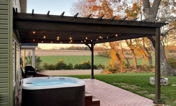 Enjoy the newly finished back patio, completely covered by an amish built pergola. Sit under the string lights and soak in the hot tub while watching the sun set across the field!