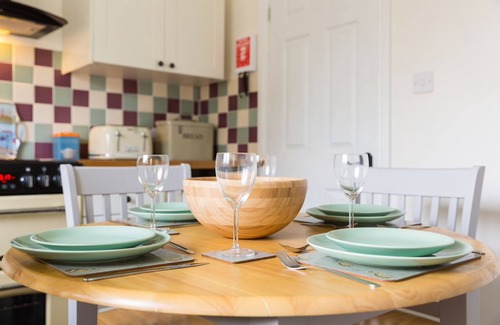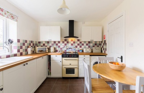 The kitchen has a Swan retro fridge freezer, integrated dishwasher, electric cooker and a washing machine. There is a table in the kitchen that opens out with 4 chairs.
