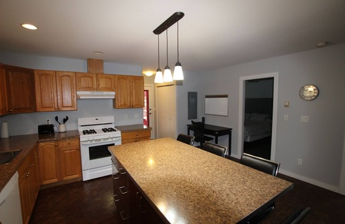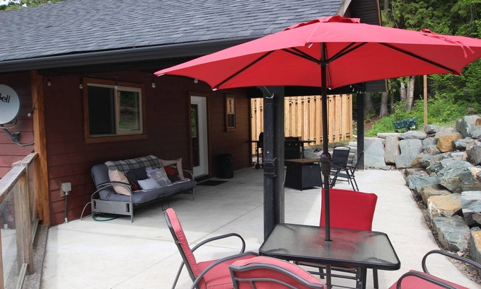 Semi-lakefront, 2 bedroom suite attached to a house with a private entrance and private outdoor area. Plenty of Parking. This suite has a sneak peek lake view. It has a private beach for guest use with dock. This 2 bedroom can sleep 6 people including pullout. You can access the trail system from the back yard or take a short walk down to the beach to enjoy the lake. The beach has a firepit area. Close to Finz and Bayside Marina and Grill.