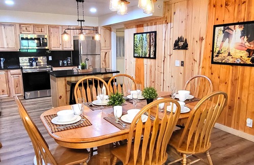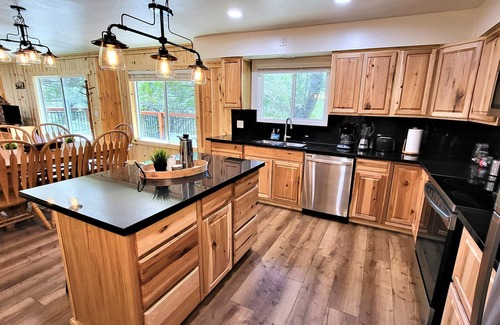 The kitchen and dining area are open to the living room and are set up to be modern yet retain the feel of a rustic pine cabin. Basic appliances, dishes, and utensils are available.