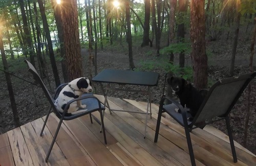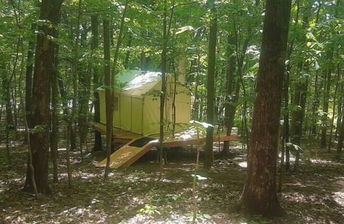 Incredibly Pet and Family Friendly. The shower house is a treehouse. There is an outdoor kitchen that is shared, that has a large blackstone griddle running drinking water & 3 burner stove. Exploration of our woods is really encouraged, we have 3 miles of trails. Situated very close to local, state trails, waterfalls and forests. We are in between Nashville and Gatlinburg TN, up on the Cumberland plateau. Your parking space will be about 180 feet from the tent Our workshop/home is close to the shower house if you should need anything