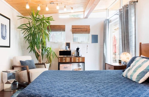 Indulge in the tranquility of this detached guesthouse. The suite located behind the main house features an exclusive entrance, a soothing color scheme with wood finishes, mid-century furnishings, and an enclosed patio space. The spacious yard is shared with two other short term rentals on the property and the owner's home (owners live on site and are available at all times).