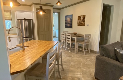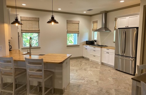 This 2/2 home is well stocked with all the essentials needed for your stay. The open floor plan of this cozy home creates the perfect setting for memorable family gatherings and entertaining. There is a vaulted ceiling in the great room. The kitchen is equipped with all brand new GE stainless steel appliances, butcher block countertops, and a gas cooktop with vented hood. Both bathrooms have Kohler plumbing fixtures throughout. The numerous mature oak trees and professional landscaping on the property bring both shade and elegance to the home.