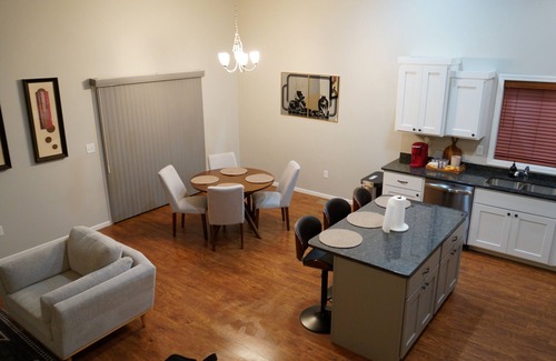 The dining area is open to the living room, with four chairs & Large dining table, plus 3 bar stools and ample country space/island for additional seating and access to patio outdoor spaces that face part of the beautiful Suite Shots golf course building, and more attractive views from the house.