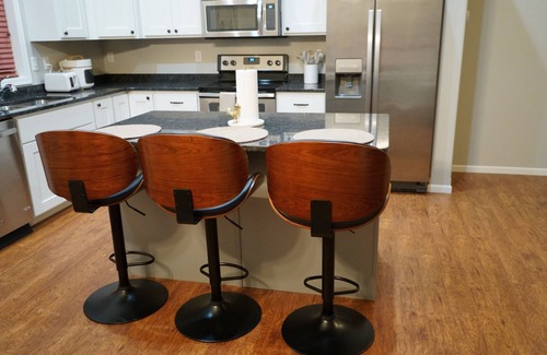 The kitchen is well-equipped with contemporary appliances and all the cooking needs. Pots and pans, serving utensils, dishes, and silverware are provided. Kid's dishes are also supplied!