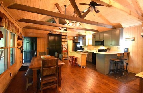 This lovely 2 bed/2 bath is a perfect getaway for any couple or family wanting to escape the struggles of everyday life. Relax next to the cozy campfire outside or enjoy the tranquility of the cool running creek from the comfort of this rustic cabin, thus giving the name Serenity . Both bedrooms and living space is on one level. Also, cabin is at the end of road with a gate that gives you that privacy you may desire.