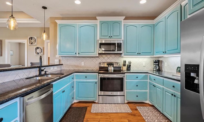 PRIMARY BEDROOM (KING), 2ND BEDROOM (QUEEN), 3RD BEDROOM (QUEEN, FULL/FULL BUNKBED W/ TWIN TRUNDLE), LIVING AREA (SLEEPER SOFA). PRIMARY BATH (TUB/SHOWER COMBO), BATHROOM 2 (TUB/SHOWER COMBO).