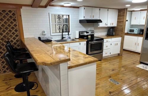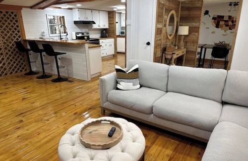 Relax with your family at the peaceful Serenity Farmhouse, a beautifully renovated cabin set on 4 private acres. Nature surrounds you with a blue fish-filled pond (catch & release), swings, hammocks, and plenty of space to enjoy the outdoors.