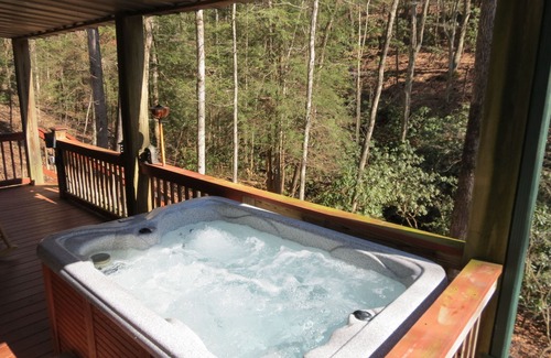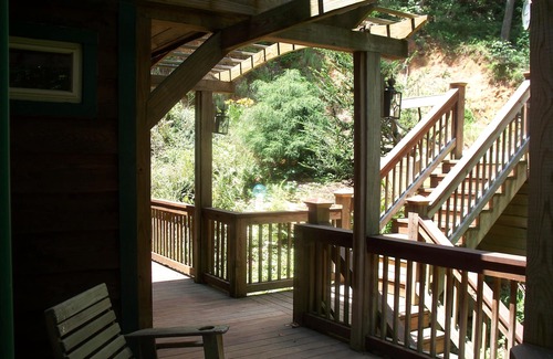 One of my guests describes my cabin better then I can: 'A unique architectural gem set in total privacy in a forest of rhododendrons and white pines overlooking a flowing creek is guaranteed to please your senses. The song of tumbling waters cascading down the creek is the background music while you enjoy the hot tub after hiking the private trails on 8 acres. The Master Suite is like a tree house with its own balcony, bed alcove surrounded by windows to view the forest. The cabin is well stocked with everything you could need. Watch an old favorite movie, or read a good book and warm yourself by the wood burning stove. Or, sit by an outdoor fire pit next to the creek and share conversation and dreams with someone you love. Then grill your choice of steaks on the gas grill while you watch the wildlife in the forest across the creek. A short car ride can take you to several waterfall and hiking options in the nearby wilderness areas: or, to shopping and restaurants in Ellijay or Blue Ridge. And don't forget the numerous places to buy apples around Ellijay. The pictures of the cabin do not do full justice to how pretty and private it really is. The condition is like new and the owner is incredibly accommodating and considerate of your every need. I highly recommend 'Serenity on the Creek' to anyone looking for a special getaway in the Georgia mountains. '
