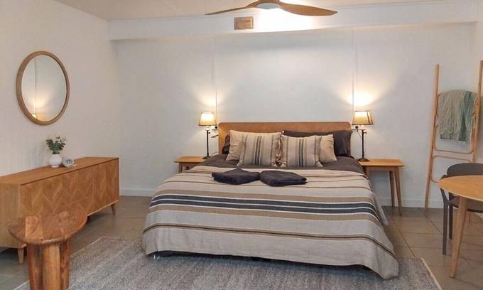 The studio is one of four elegant individual king bedrooms located beneath the main Guesthouse, featuring an alfresco shared kitchen and dining space, and shared bathrooms, ideal for couples, solo travellers, or small groups.