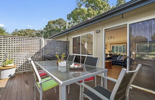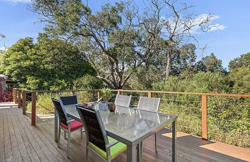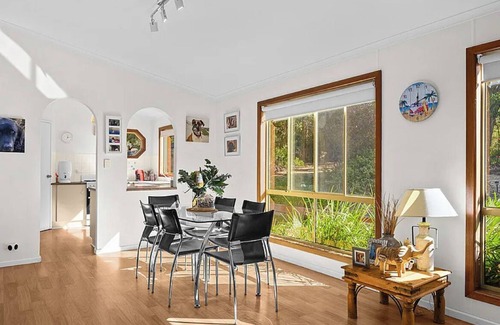 The fully fenced property is set on one acre and is landscaped with native trees, shrubs and 100 year old stringy bark trees for adults, children and pets to explore. Come inside and there are three bedrooms, two queen sized beds and the third has a double bed. The heart of the house is the living and dining space with a wood fire heater perfect for the cooler months and a split system air conditioner for all year round comfort. The large windows on both sides of the living and dining take full advantage of the northern sun. The kitchen has a gas stove and microwave available, and the property is on rain water so there is a filter in the kitchen for drinking water.