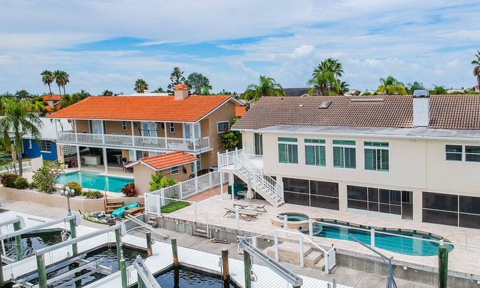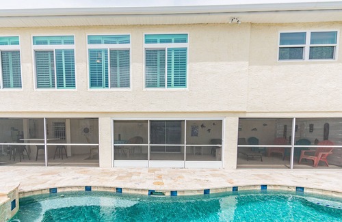 In summary, your view outside is a waterfront paradise, equipped with a gorgeous pool, spa package, travertine decking, and all the amenities of a 5 star resort. Enjoy dolphins, manatee, and exotic bird life right outside your door. Close to major shopping centers. This place is situated on a quiet residential street with the back view facing a beautiful water channel out to the Gulf of Mexico.