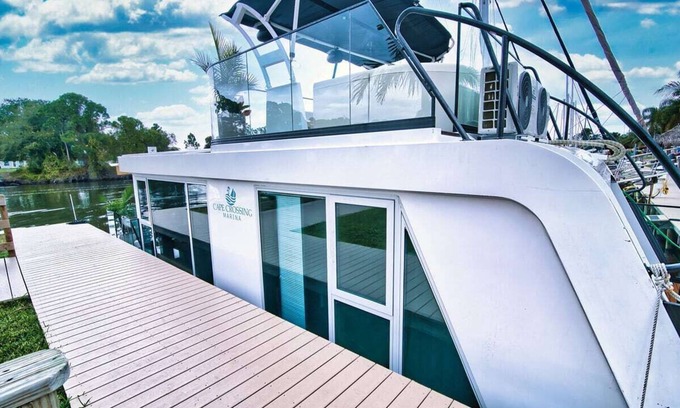 Escape to the Shangri La, a unique houseboat experience in Merritt Island's Cape Crossing Resort and Marina. This charming 1-bedroom bungalow offers stunning waterfront views, perfect for enjoying sunrises, sunsets, and even rocket launches. With a queen bed, pull-out sofa, and amenities like a BBQ grill and hot tub, you'll find relaxation and adventure. Explore nearby attractions, from water sports to theme parks, and create unforgettable memories.