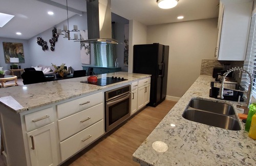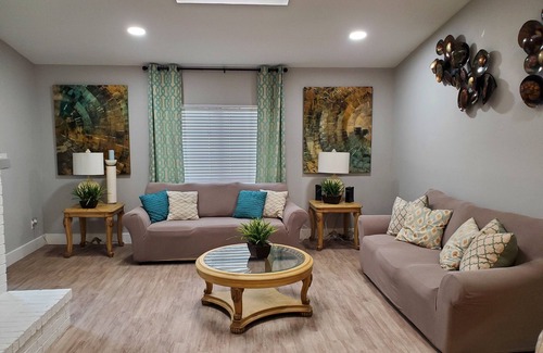 Fully remodeled 3 bedroom, 2 bath spacious home located in quiet neighborhood. Includes King bed, Queen bed, Queen bed and air mattress for extra space. Beautifully decorated. Huge backyard. Internet & streaming available. Garage access parking as well as parking alongside the street and in front.