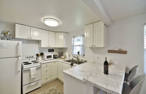 Very Popular downtown cottage. Downtown Mt Shasta with Mt Shasta Views and within a cluster of four vacation rentals that share a gorgeous landscaped yard with flowers, grass. Bella is a one bedroom, one bath cottage with all new decor. Its small but efficient. Living room has Delightful Farmhouse décor cottage.Futon couch that sleeps one comforatble. Kitchen is fully stocked with all cookware, stove, fridge, eating bar with 2 chairs. Additional small table with two chairs also. Full bathroom with tub/shower, sink. Bedroom has queen bed and chair with large closet. Linens and towels provided. Small dog ok with fee. All fresh, light & NEW.42"smartv with strong wi-fi.Fully equip. Covered Deck has patio chairs and small bbq, Grassy yard area.. Views of Mt Shasta. Walk to crystal shops, restaurants, shops. Gourmet supermarket across street. Laundry on site. Bella is one of 4 vacation rentals in Chestnut Street Village Vacation rentals. Rent one or all.