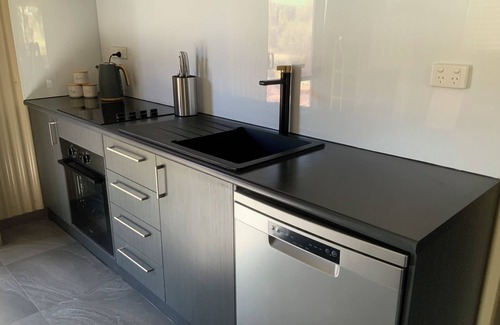 The kitchen is combined with the dining area. A modern new dining setting for 4 including plate ware, cutlery & glassware (wine glasses, charcuterie board & cheese knives too) make this an enjoyable spot to sit & enjoy the scenery of the gardens outside.