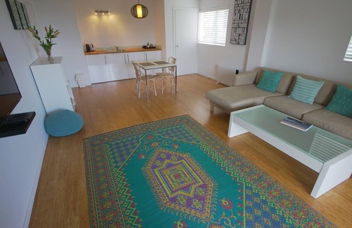 The apartment light with local art work and floating bamboo floor. It features a small but cosy separate bedroom with a queen size bedroom. The ensuite is very small with a shower, toilet and small vanity unit.