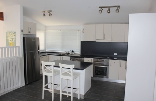 Upstairs features two generous queen sized bedrooms, with relaxing leafy views making them the perfect place to rest and recharge after your daily adventures. There is an additional study/single room which can be made up for one additional guest (maximum 9) on request for an additional nightly fee, or is the perfect place to relax with views to the northern end of long beach.
