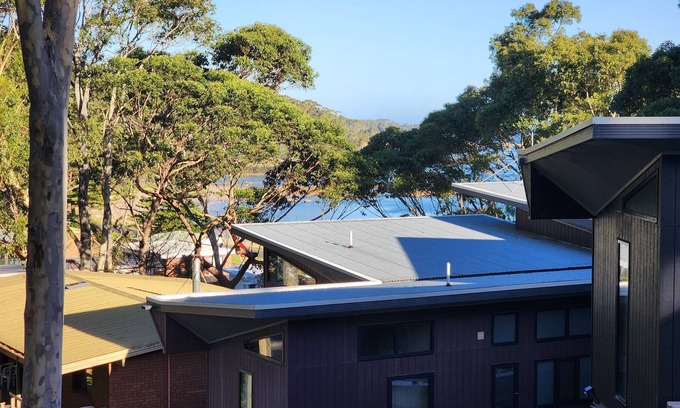 Shell Cottage is a welcoming, light-filled holiday home with stunning views over the ocean and treetops in Long Beach, NSW. The house has been designed for families and travellers to relax and unwind in a coastal bush setting. This spacious property is perfect for large or extended family groups with sleeping arrangements for up to 9 people.