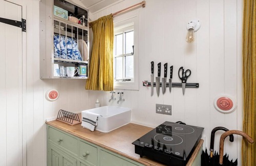 The Rumple Hut is large for a Shepherd's Hut and has a powerful wood burning stove at its heart. It acts as an oven, hob and heater for the Hut. There’s nothing better than waking up and preparing your morning cup of coffee over flame but we also offer a two hob induction hob if you are in a rush. We provide all the seasoned wood and kindling you will need for the burner throughout your stay.