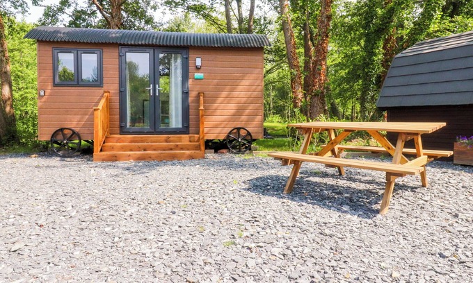 Shepherds Hut 2, a single-storey retreat, consists of a studio-style layout including a double bed, a kitchen with microwave, fridge with freezer compartment, toaster, and kettle, and a dining room with breakfast bar seating two guests and a wood-burning stove. There is an external shower room with walk-in shower, basin, and WC. WiFi, fuel, power, bed linen is included in the rent; please bring your own towels. Outside, there is a front gravelled area with a picnic bench, barbecue area, shared lawn area with swing, and non-enclosed rear lawn area with pond, plus designated off-road parking for one car. Sorry, no pets and no smoking. Shop 1.2 miles, pub 2.7 miles, lake 0.1 miles, river 1.1 miles. Shepherds Hut 2 awaits your next escape. Note: Although this is a single-storey property, there are steps up to the property. Note: Fishing is available at 4 lakes on site and all included in the price; must have a fishing license to show if requested.