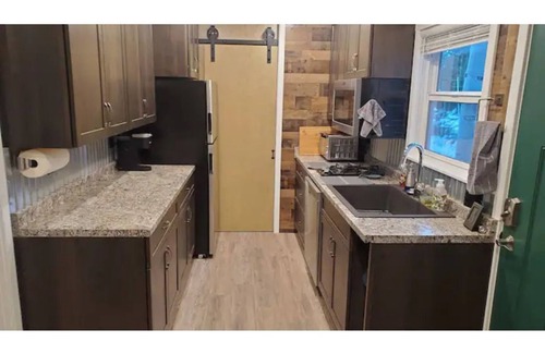 One goal I had when designing and building this was to create a magical place. I created an elevator, painted the northern hemisphere stars and constellations on the bedroom ceiling, made custom woodwork, and installed peaceful outdoor lighting to create a space that feels unique, relaxing, and magical. Our original BnB in Alpine had 5.0 stars, but burned to the ground in 2020 in the Castle Fire. We were inspired to build something completely new in a quaking aspen grove in nearby Ponderosa. This cabin has been custom designed and built as a new model of construction, to meet the needs of fire recovery, low income housing, and ecological design. It was designed and constructed to meet all the current and modern requirements. The space consists of an 8x20 bath/kitchen/dining area, an 8x20 bedroom with desk and wardrobe, and an 8x20 attic bedroom. The stairs to the attic are steep and not suitable for small legs or those who are unstable on their feet. The stairs are on a custom-made elevator lift to rise up into the attic when not in use. Attention to detail at every level is maintained. Custom woodworking, aspen leaf table and metal sculpture are highlighted.