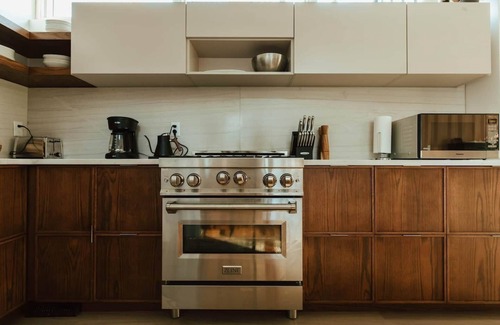 When you arrive to the Hygge, take notice of the Scandi vibe and unique look - can you tell it was built with shipping containers? Wait until you see the back side where four of the bedrooms have their own private patio created from the doors of the containers. Mighty yet minimal this one.
