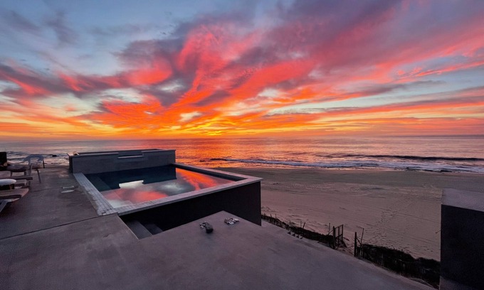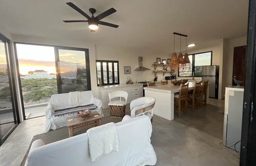 Casa Fortuna is a minimalist-modern, oceanfront retreat on the beautiful white sand beach of the East Cape. Perched on the apex of the first arroyo off of the highway, the residence boasts staggering ocean views and a private top-of-the-world feel. Secluded off-grid living, but just 20 minutes back into town where world class art, shopping & dining await. Casa Fortuna is an irreplaceable surf-centric local, just, 0.5 miles to the first point of Shipwreck, 2.75 miles to La Fortuna and 5.5 miles to Nine Palms. Whale watch by day from the back pool deck and enjoy stunning sunsets from the front above the Sierra de la Laguna mountain range.