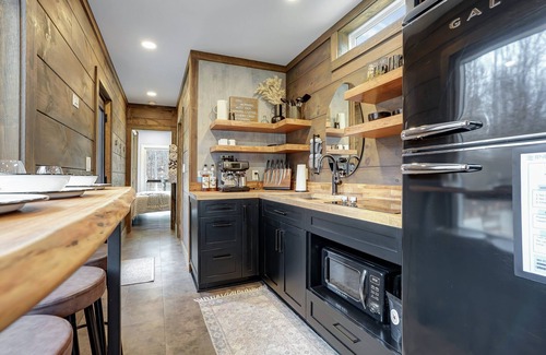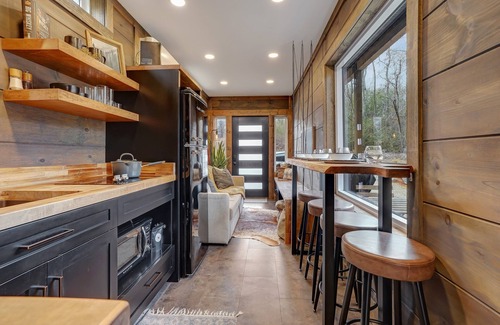 Immerse yourself in the magical outdoors by stepping out on the wraparound deck from the kitchen, offering a private setting where you can relax, sip your morning coffee, and gaze at the beautiful setting! The tranquil sound from the custom built waterfall is the perfect background noise to your day. Spend the day relaxing by the hot tub, reading a book in the hammock, or sunbathing next to the waterfall. While the interior of this home is stunning, we have a feeling that you will be spending most of your time outside during your stay at the Green Creek Shipyard 2.0!
