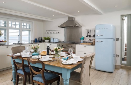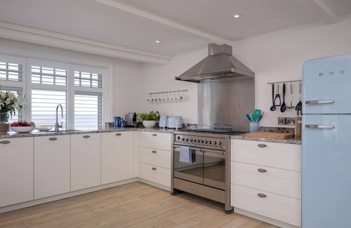 The fabulous 'living kitchen' with dining area has wonderful view of the beach and sea.