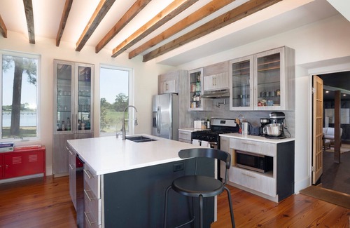 The separate carriage house is 150 feet from the main house providing an appropriate remove and equally charming. Entering a magnificent open arrangement of kitchen, living, and dining areas, this attractive and comfortable cottage has a water presence on a tidal pond that frames nature’s beauty with a wall of windows. The beautiful wood floors, exposed hand hew wood rafters, and craftsman-style kitchen cabinets add warmth.