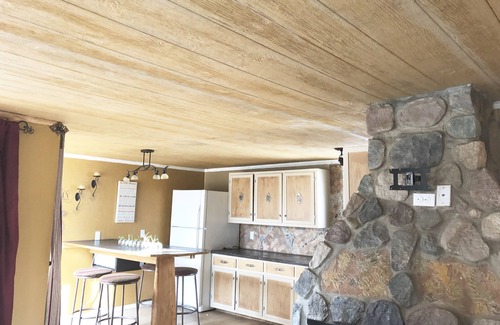 Beautiful hand crafted rock fire place, large yard and all the comforts of your own home. Brand new king and queen beds and conventielly close to all northern michigan has to offer.