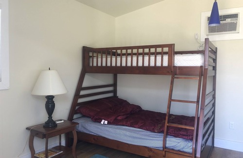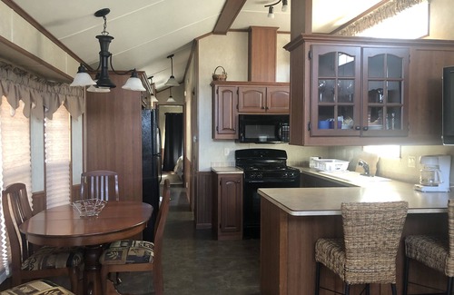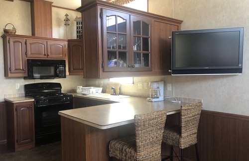 This beautiful park model cottage has a gorgeous mountain views from its covered deck, a great place to take in the sunset. This rental includes a fire pit and picnic table, patio table, bbq, dishwasher, stacker washer/dryer, TV with dvd & cable, bathroom with bath and shower, instant hot water, A/C, queen bedroom, double/twin bunk room, full living room with pull out couch, and a detached bunkhouse with single/double bed and heat/ac (additional charge.)