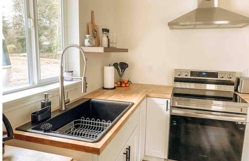 When you enter Si View Abode you will see the kitchen and main living area equipped with TV for streaming, all the amenities needed to cook your favorite meals, and a comfy couch. And, of course, high speed internet.