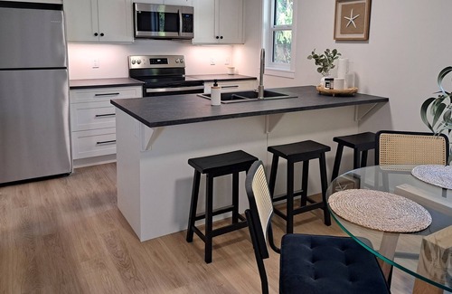Kitchen table for 4 as well as a bar that seats 3. Kitchen is stocked with all essental cooking tools as well as some basics such as salt, pepper, cooking spray, and some spices.