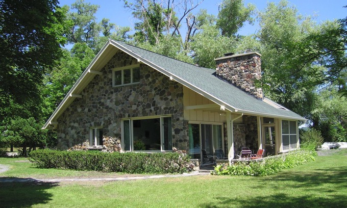 The smaller cottage was built in 1948 for our grandmother -- we call it Gram's House. If you visited your grandmother at a lakefront cabin, this cottage will seem very familiar. It has a large screened porch across the whole front of the house, with a dining room table that expands to seat ten -- also a chaise longue and wicker chairs, and a pass-through to the kitchen. The living room and kitchen are knotty pine with a stone fireplace. The house has three bedrooms, one with queen, one with twins, and one with a twin bed, plus one full-size bath. Occupancy is five, and square footage is about 900 square feet.