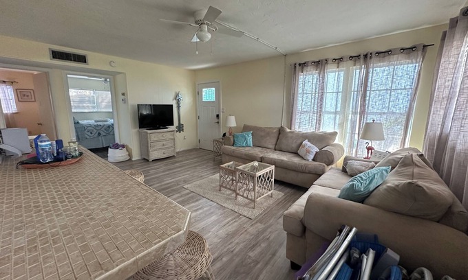 Recently added 10 foot privacy wall to extend more privacy and quiet throughout the property. We are snuggled between newer buildings and yet extremely close to the beach for the value price per night. Full 2 bedroom 1 bath home great for 14 night stays or longer during off season.