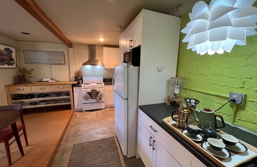 You have access to the entire private bottom floor apartment. Private deck with BBQ & table/chairs. Full kitchen with basic supplies. We are artists & use the space as a studio when not hosting. Therefore some storage areas are not for guest use. Our items are tucked out of sight, with plenty of room to unpack. Not an empty space, so stays over 3 months not accepted. No lease option.
