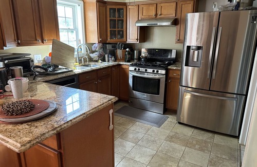 Take a single room or the house to yourself! This home has lots of room w/a 75" & 65" smart TV in 2 living room areas! Washer/dryer available as well as exercise equipment with yoga mats. 4 bedrooms and bathroom in master suite. Fireplace. Full kitchen with a deep freezer. Deck w/chairs and fenced back yard. Wireless printer. House sits on a quiet street. Driveway fits 3 cars! Central air in home. 2 couches also have pullout beds and there 2 air mattresses as well. Great home away from home!