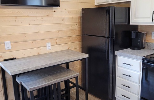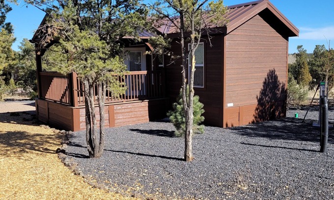 Cozy single story Cabin equipped with full kitchen with most of the amenities from home features two master bedrooms with queen size beds and 1-1/2 bathrooms Living room has a fold out couch FREE WIFI internet with a flat screen TV Streaming only , and outdoors a large patio with a private Hot Tub! and a gas grill, cozy fire pit and there is also a Water park splash pad. We are pet friendly $50 per pet for the duration of your stay
