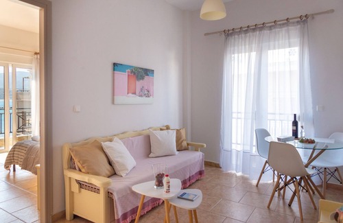 A recently renovated apartment located on the 2nd floor of an apartment building. Walking distance to Sitia's sandy beach (just 350m away) and a selection of restaurants/bars/shopping. It boasts bright and modern interior, queen bed, AC, fully equipped kitchenette, washing machine, spacious bathroom with shower, indoor dining table, balcony furniture and a great sea view. Stairs access. Note that the house is located on the main port promenade. While the road is free from traffic there is signficant noise when sitting on the balcony from people and music from bars.