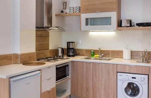 A recently renovated studio apartment located on the 1st floor of an apartment building. Walking distance to Sitia's sandy beach (just 350m away) and a selection of restaurants/bars/shopping. It boasts bright and modern interior with wooden floor, queen bed, AC, fully equipped kitchen, washing machine, spacious bathroom with shower, indoor dining table, balcony furniture and a great sea view. Stairs access. Note that the house is located on the main port promenade. While the road is free from traffic there is signficant noise when sitting on the balcony from people and music from bars.