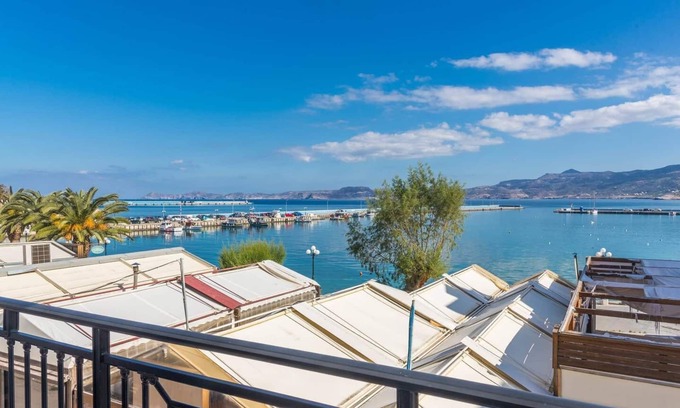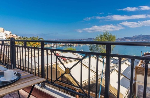 The balcony offers uninterrupted view of the sea and the port promenade below. A small wooden table and 2 chairs offer the perfect spot for a hearty breakfast before heading out to town or the local beach.