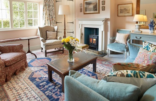 The sitting room features comfortable seating around a cosy wood burning stove and a large window seat. The dining room comfortably seats seven guests and also has a wood burning stove to keep guests warm in the winter. Just off the farmhouse kitchen is a convenient cloakroom and boot room with stairs down to the cellar, where guests will find the laundry facilities. Upstairs has three bright bedrooms and two bathrooms, one of which features a roll-top, claw-foot bath and separate walk-in shower.