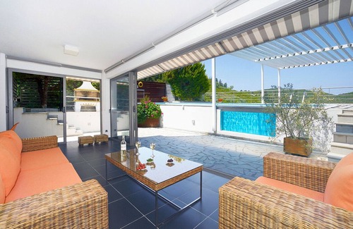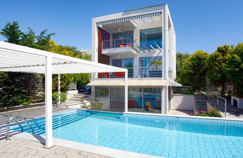 Villas Loukas is the ideal location for those who don’t want to drive on vacation. This luxurious villa is just a 5-minute walk away from the beach and a 10-minute walk from Sivota. Visit to relax on the beach or go on an adventure and take a tour of ancient world heritage sights in Albania or book a private yacht for the day around Paxos and Anti Paxos. This contemporary villa is situated on the edge of Sivota village, very close to the peaceful bay of Karvouno. All floors have a balcony or access to terraces, and there is an additional living area and kitchenette on the lower floor. We recommend this villa for a couple or a family with older children, who might also enjoy the freedom of being able to wander down to the beach bar and restaurant close by. The pretty harbor of Sivota with its pretty tavernas, cafes and bars are within walking distance, as is Bella Vraka beach which has excellent water sports such as canoeing and sailing. Villa Loukas can be booked with neighboring Villa Amalia for two families or a group of friends on vacation together. They are entirely separate properties with hedges in-between for privacy. Smoking - not allowed. Extra: AIR CONDITIONING Free of charge , BARBECUE Free of charge , ELECTRICITY Free of charge , LINEN AND TOWELS Free of charge , PRIVATE CAR PARK Free of charge , PRIVATE SWIMMING POOL Free of charge , WASHING MACHINE Free of charge